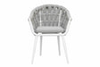 Silla de comedor modelo Viken. Estructura de aluminio color blanco y cuerda elástica en Olefina color gris claro. Cojín de asiento de 5cm color gris claro.