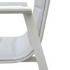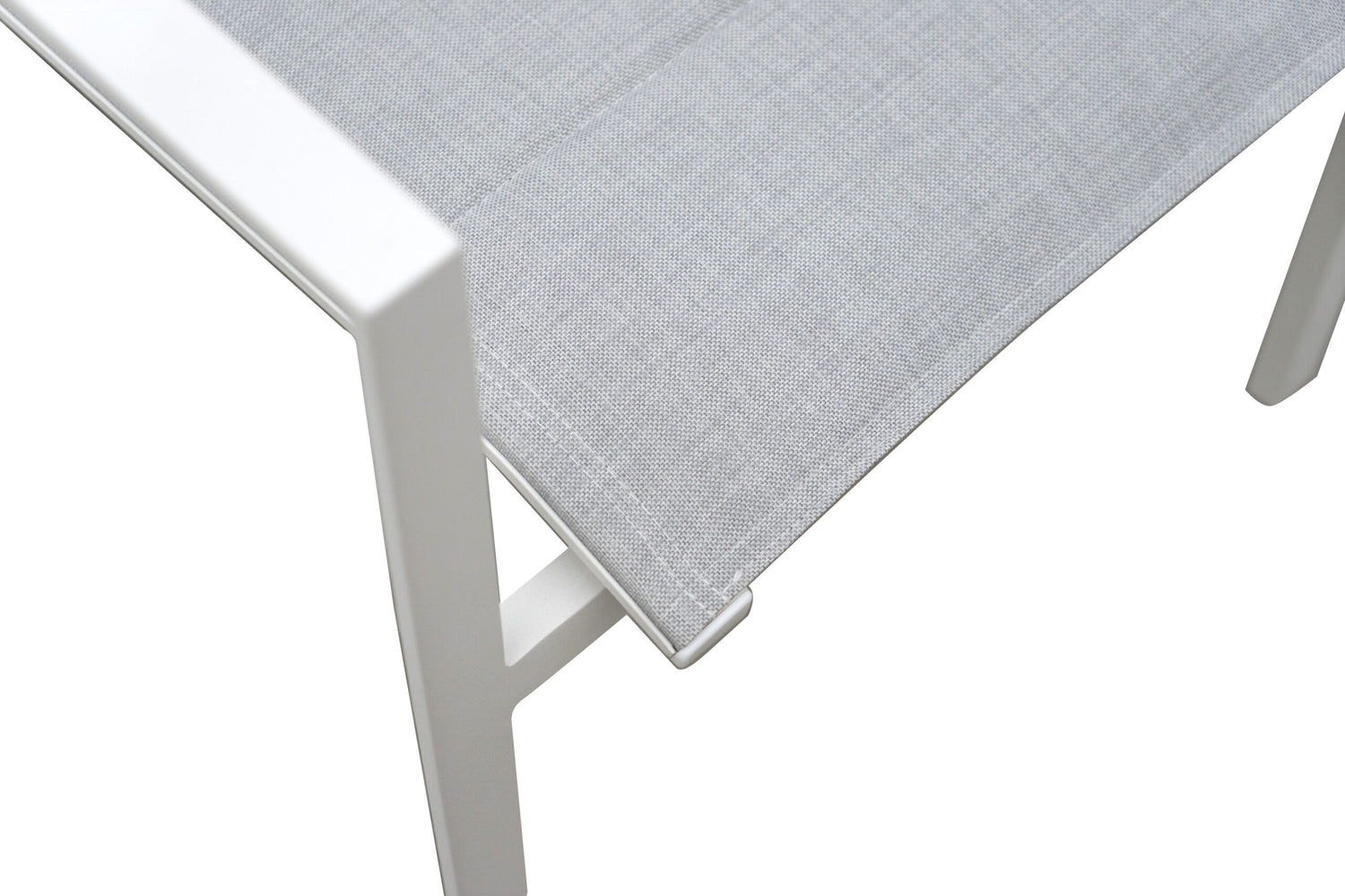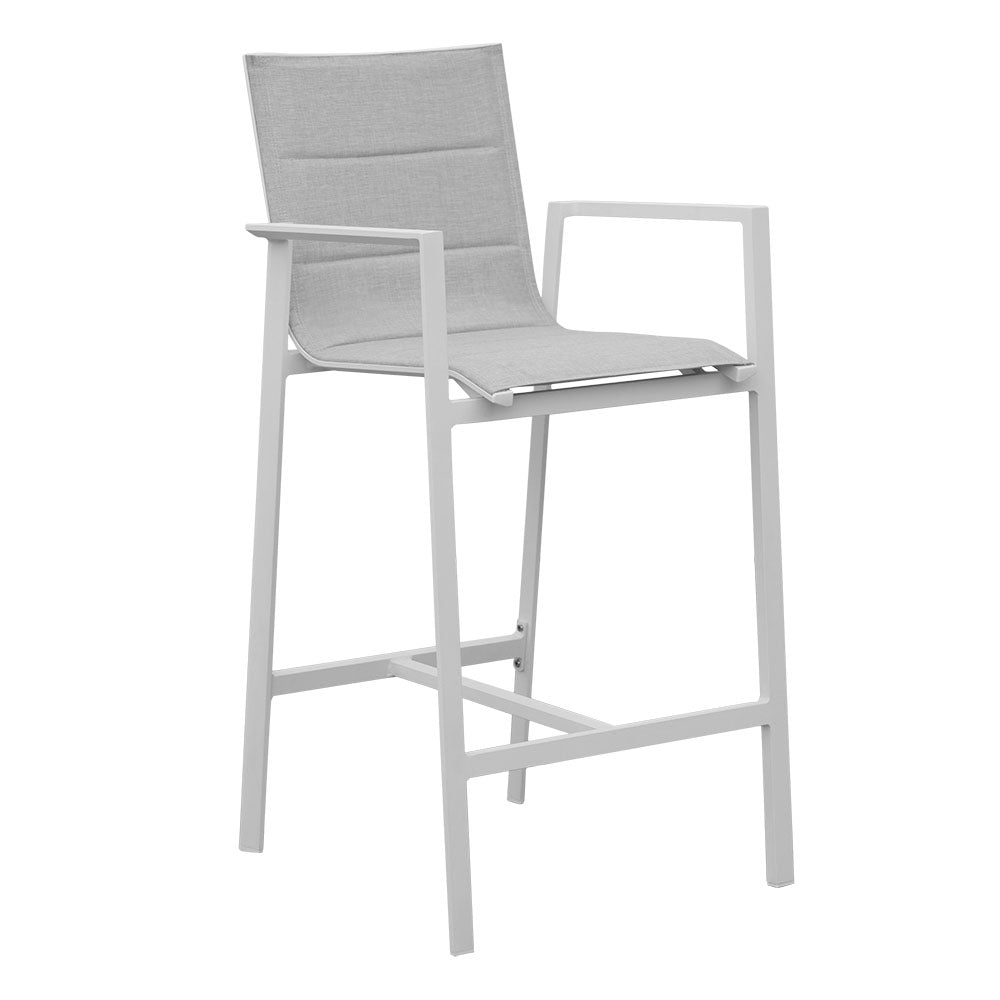 Taburete alto con brazos Isabelle. Estructura en aluminio color blanco y textilene de doble pared con Quick dry foam color gris claro. Alta resistencia a la intemperie. Apilable.