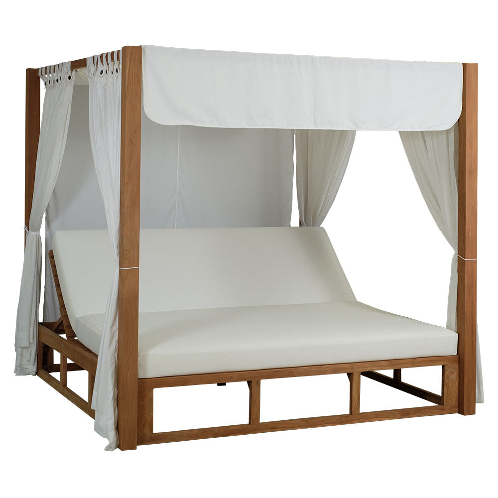 Daybed Nirea. Estructura en teca de primera calidad con herrajes en acero inoxidable. Cojineria waterproof (14cm) color crudo. Cubierta superior y cortinas incluidas. Requiere montaje.