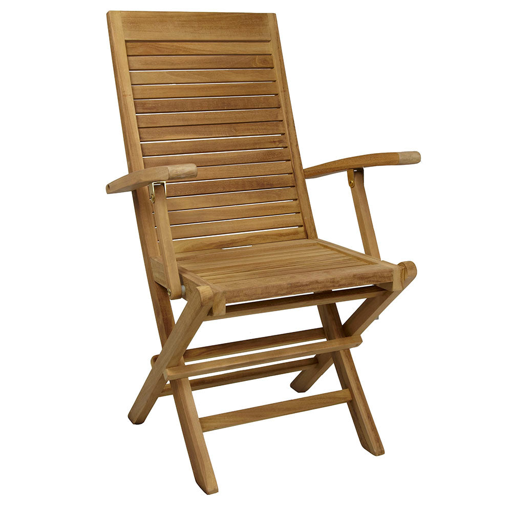 Silla de comedor Sunny con brazos. Estructura en teca de primera calidad. Herrajes terminación latón / Inox. Cojineria (4cm) opcional. Plegable.