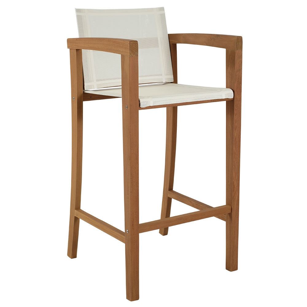 Taburete alto modelo Edson. Estructura en teca de primera calidad y textilene Batyline color blanco. Herrajes en acabado inox. Requiere montaje.